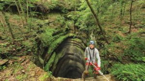 A caver prepares to rappel into the Neversink pit. Photo courtesy of Alan Cressler