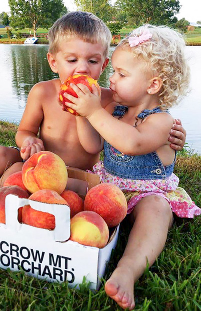 Ty and Elli Anna Bodine enjoy their Crow Mountain peaches.