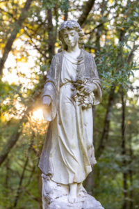 “The rumor is that she comes down off of that statue at night and walks around,” Crowell says. “I’ve not seen that for myself, but I have seen a dark shadow figure behind it. I’ve got a picture of a woman kneeling down and looking at a grave, and I’ve got a picture of a figure sitting on Miss Willie’s stone.”
