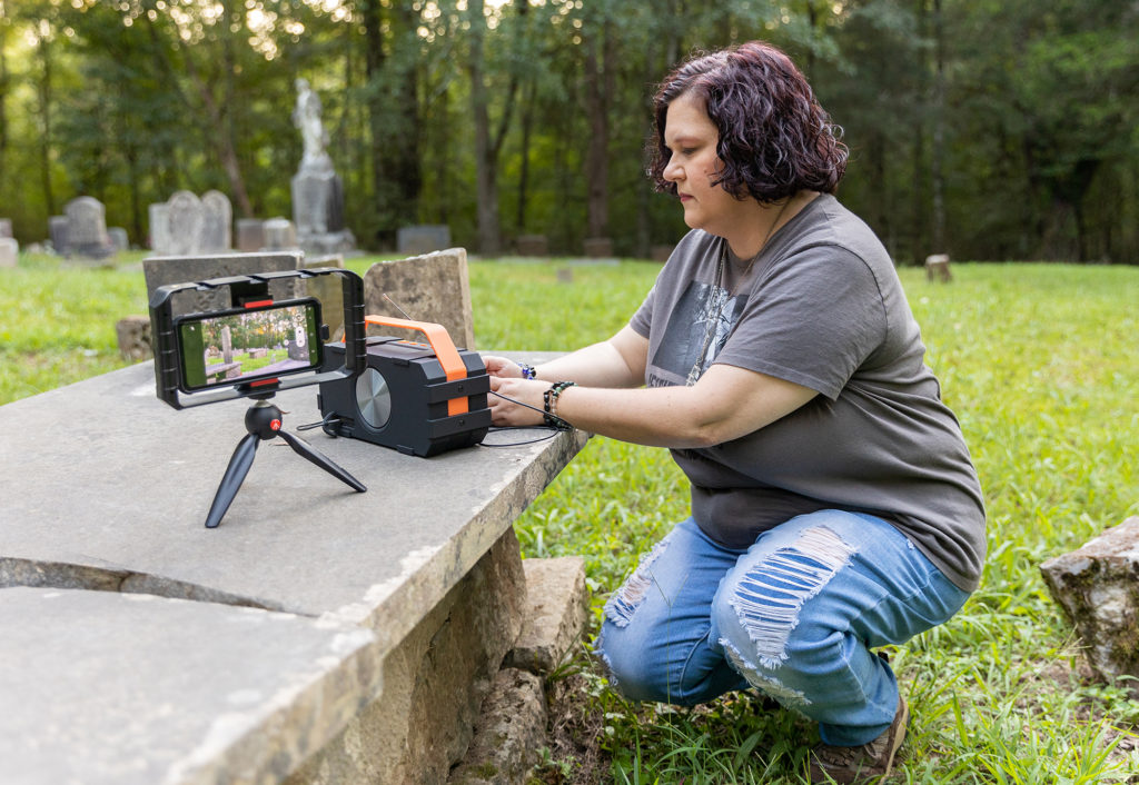“In that particular video, I was in a different section of the cemetery. When I went back to listen to the recording, I heard a woman’s voice whisper, ‘So, do something,’ and immediately, the REM-Pod started going off,” she says.