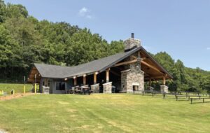 A few steps from the wagons is a new 4,200-square-foot pavilion housing restrooms and showers, a large covered patio with seating and an open fireplace, an enclosed commercial kitchen, and meeting rooms. Completed in 2024, the building serves campers but also hosts outreach and educational programs offered by the Alabama Cooperative Extension System, which owns and oversees Graham Farm and Nature Center.