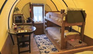 The wagons are crafted for glamping by Idaho-based Conestoga Wagon Co. The exterior maintains classic Conestoga design, with fully functioning wheels and a double-domed, arching canvas.